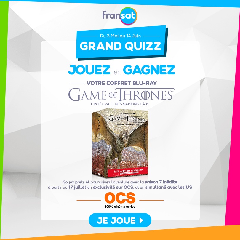 Evénement ! Pour revoir l’intégralité de la série Game Of Thrones et tout comprendre de l’intrigue avant le lancement prochain de la Saison 7 inédite sur OCS, FRANSAT organise un Grand Jeu Concours sur Facebook.